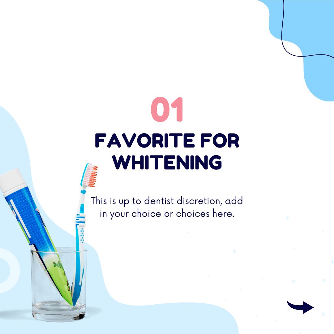 Description: Customize this informative post and slide series with your brand’s signature elements—fonts, colors, and logo—to make it unmistakably yours. For an extra personal touch, snap a photo of a provider or tech holding their favorite toothpaste in the office! 📸 Upload it to Canva, use the background remover for a clean look, and place it on your slides. If you have sample photos for each toothpaste recommendation, add those to make the content even more visually appealing.